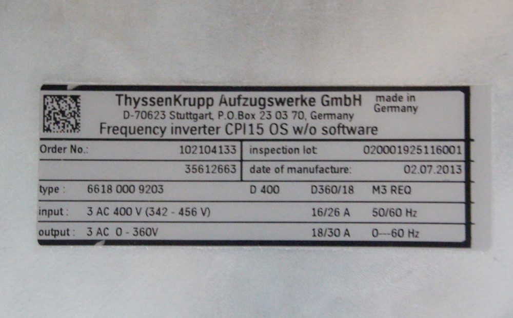 发布时间:2015-06-25 11:30:05 点击量:德国进口蒂森电梯变频器CPI15